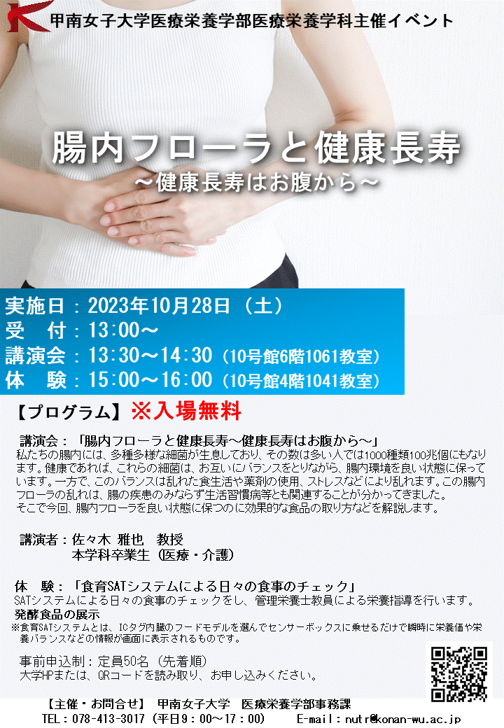 甲南女子大学 医療栄養学部は、食と栄養、医療を学んだ専門家である管理栄養士を養成しており、教育・研究活動を生かした地域貢献活動の一環として、地域住民などを対象にイベントを開催しています。今年度は「腸内フローラと健康長寿~健康長寿はお腹から~」と題した講演会と、栄養指導体験会の二部構成でお届けします。年代を問わず地域住民や同窓生など広く参加いただけるように、大学祭・ホームカミングデーにあわせての開催です。