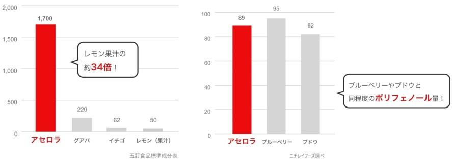 ニチレイフーズは、1986年に「ニチレイアセロラドリンク」を発売して以降、アセロラビジネスを本格的にスタートしました。アセロラは、レモン果汁の約34倍のビタミンCと高いポリフェノールのダブルの作用により、高い抗酸化力があるスーパーフードとして改めて注目を集めています。