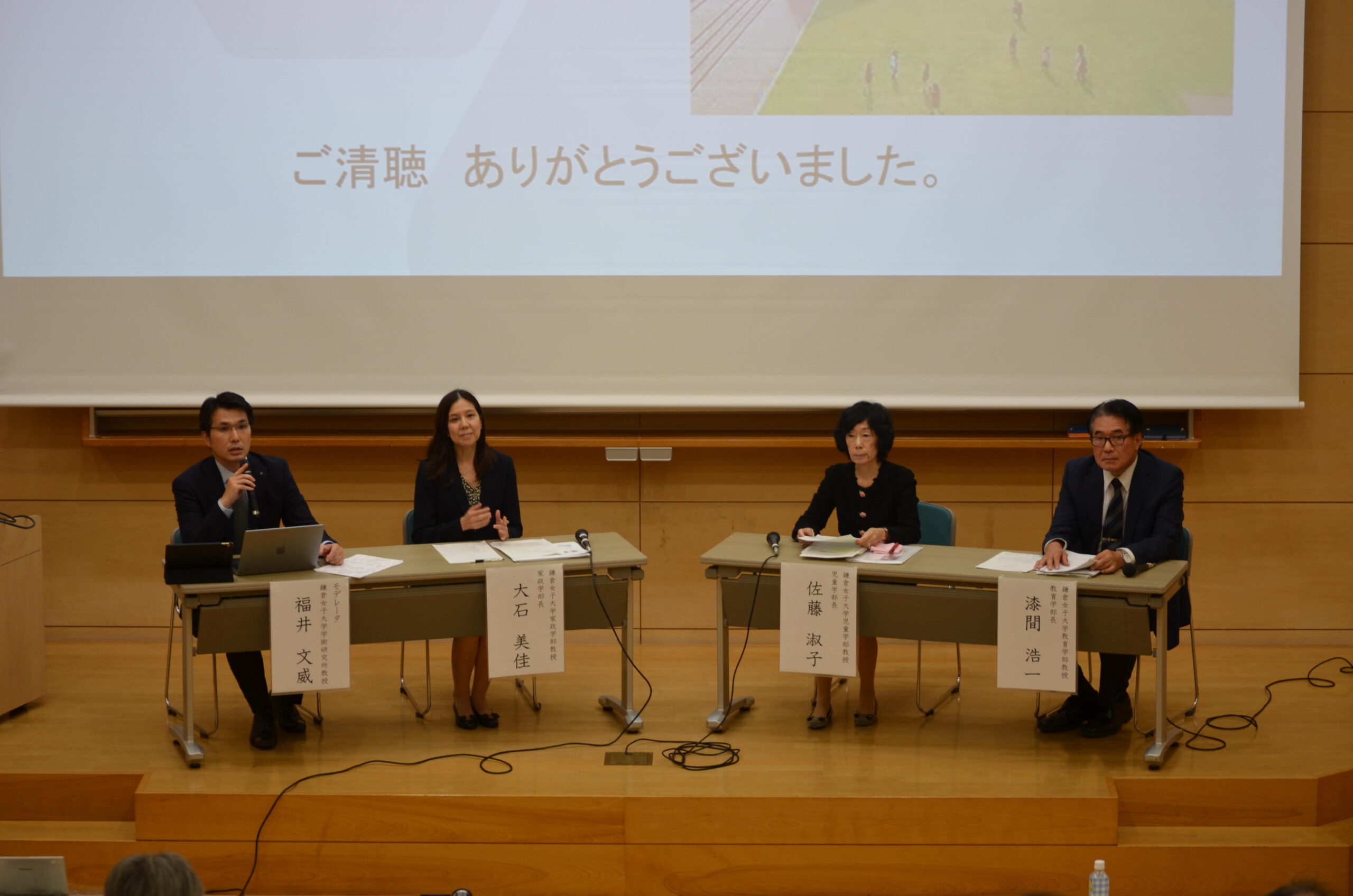 パネリスト: 大石美佳(鎌倉女子大学家政学部教授/家政学部長)、佐藤淑子(鎌倉女子大学児童学部教授/児童学部長)、漆間浩一(鎌倉女子大学教育学部教授/教育学部長)