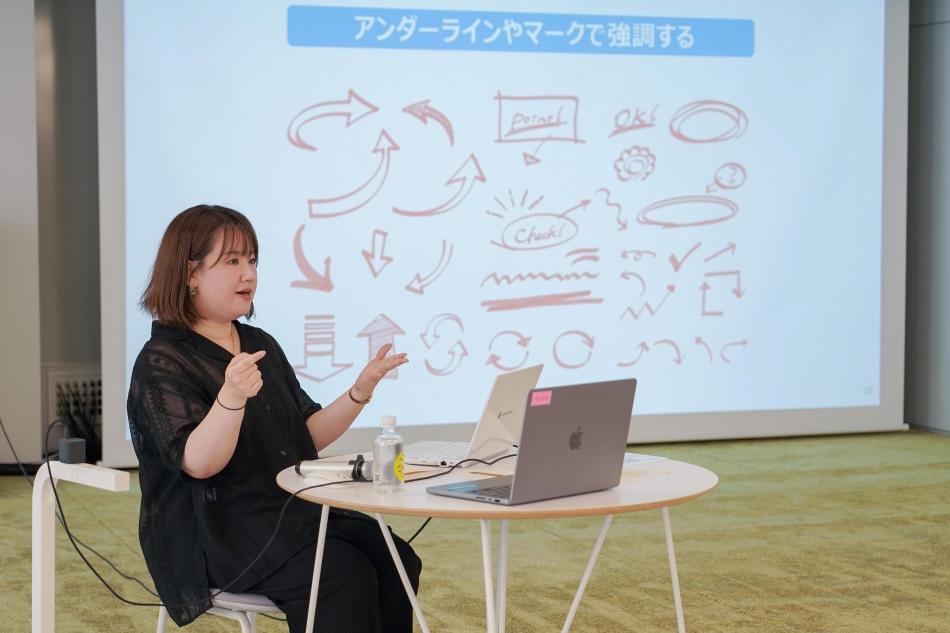 講座では、明日からすぐに活用できるグラフィックレコーディングの基本から応用までを紹介。講座の半分は実際に手を動かすワークで構成され、楽しんで体験できる内容になった。