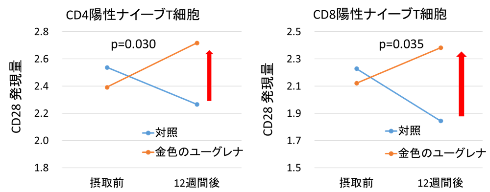 ・CD4陽性およびCD8陽性ナイーブT細胞において、パラミロンEOD-1群は対照群と比較して、情報伝達に必要なCD28の有意な上昇が確認された(図3)。