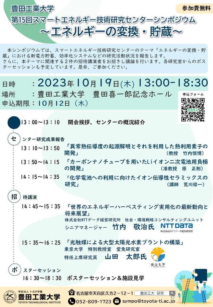 スマートエネルギー技術研究センターのテーマ「エネルギーの変換・貯蔵」における新電力貯蓄、効率化システムなどの研究活動状況を報告します。さらに、本テーマに関連する2件の招待講演者をお招きし議論を行います。各研究室からのポスターセッションも予定しています。