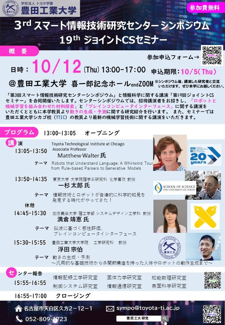 「第3回スマート情報技術研究センターシンポジウム」と情報科学に関する講演「第19回ジョイントCSセミナー」を合同開催いたします。センターシンポジウムでは、招待講演者をお招きし、「ロボットと機械学習を組み合わせた材料探索」と「ブレインコンピュータインターフェース」に関する講演をいただくとともに本学教員より動きの生成・予測に関する研究紹介を行います。 また、セミナーでは豊田工業大学シカゴ校(TTIC)の教員より最新の機械学習技術に関する講演を行います。