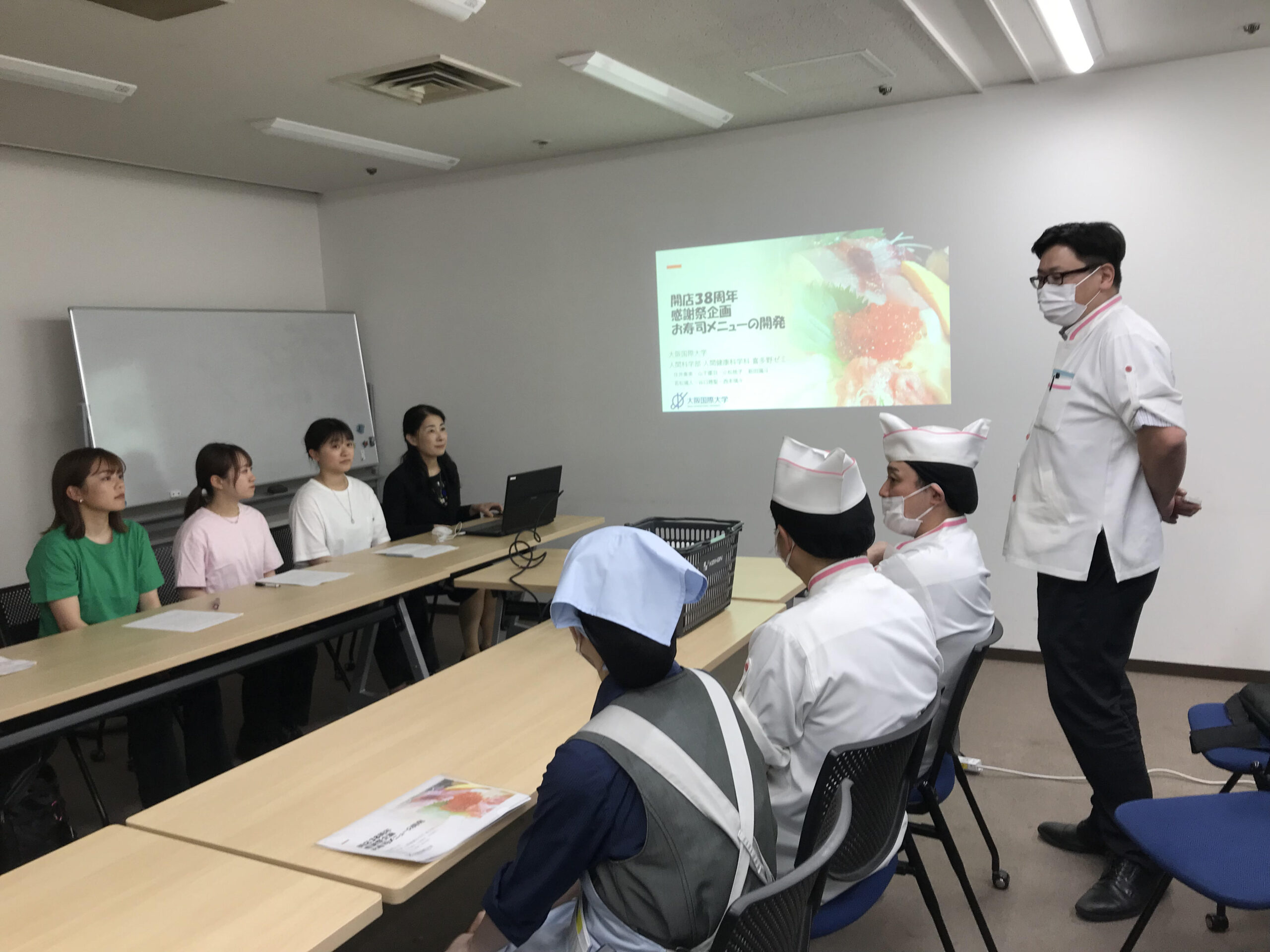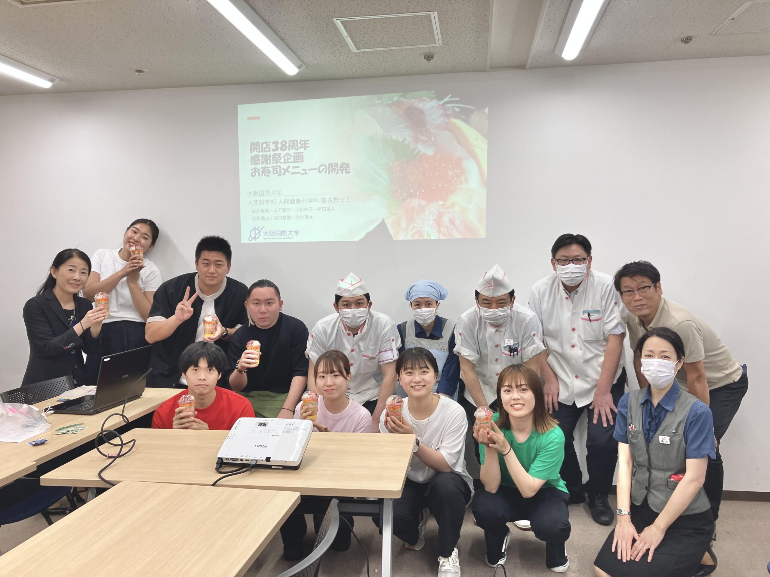 「寿司パフェ」は、同学科 喜多野宣子准教授の指導の下、喜多野ゼミ3年生を中心としたメンバーが、商品コンセプトについて数か月にわたって試作や意見交換会を重ね企画した商品である。「カラフル」をテーマに、見栄えだけでなく、京阪百貨店の新鮮な海鮮を使用した上で、味のバランスや食感の変化で食べても飽きが来ないようにと何度も試作を繰り返し商品化された。 販売価格も、学生が求めやすい価格帯にするため何度も話し合いを行ない、税込1,000円で販売することとなった。