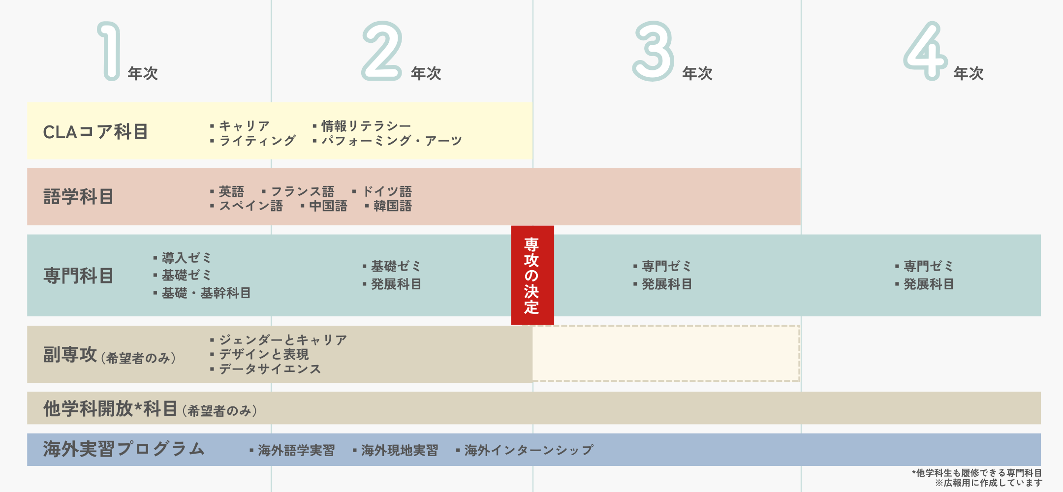学生は、各学科、専攻の専門科目に加え、CLA(全学教養機構)を基盤として