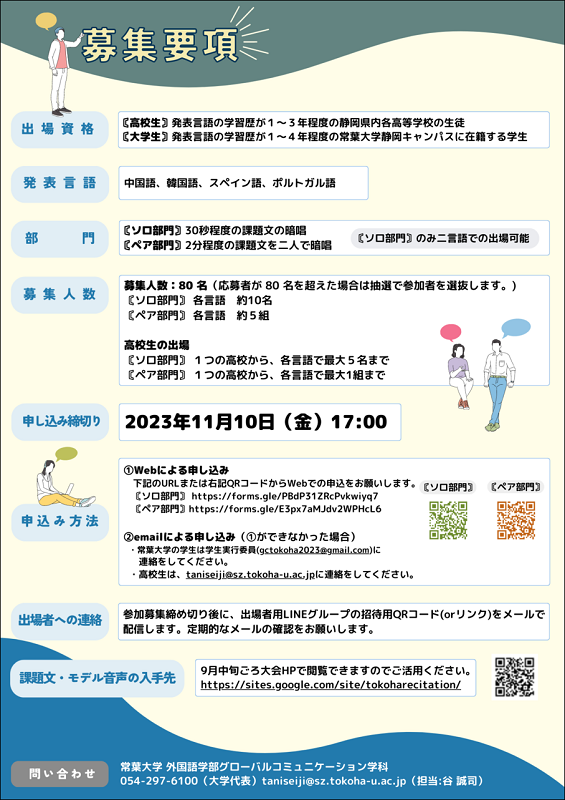 出 場 資 格 : ・大学生:発表言語の学習歴が1~4年程度の常葉大学静岡キャンパスに在籍する学生