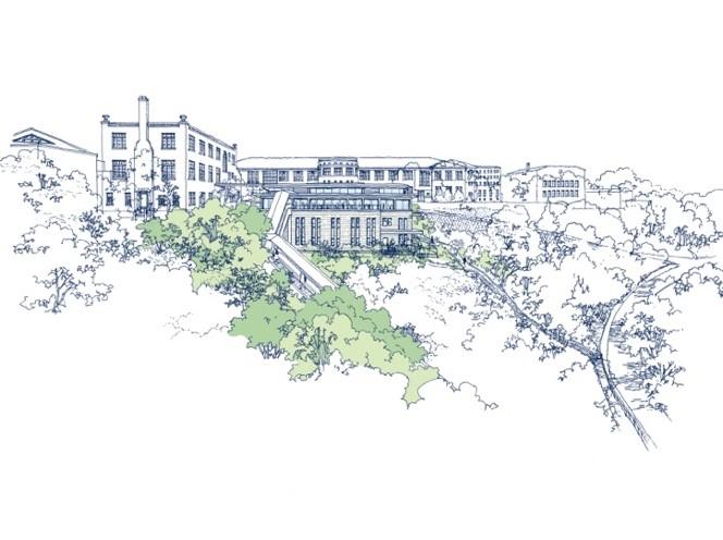 ヴォーリズの精神を承継しつつも模倣はしないことが設計のコンセプト。ヴォーリズの基本的アイデアである中庭、建物間の軸線を合わせること、回廊で建物を繋ぐことを活かし、地上部分にラウンジを設けて、これまで裏側であった理学館西側地域を新たなエントランスとする。ラウンジは豊かな緑に臨み、周りに巡らした回廊は、人々の出会いの場となる。そして、低く抑えた建物は重要文化財の理学館と社交館を引き立て、一方で、理学館はラウンジと同一軸線上にあるため、その借景として活かされる。