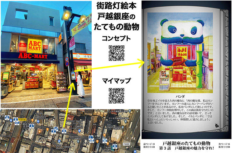 この展示は、再開発の影響を受けて失われつつある商店街の文化を再評価し、新たな視点から都市の魅力を再発見することを目的とした、戸越銀座商店街連合会との連携企画。戸越銀座商店街内の建物を動物に見立て、それを動物キャラクターに変え、絵本の各ページを街路灯に順番に展示している。