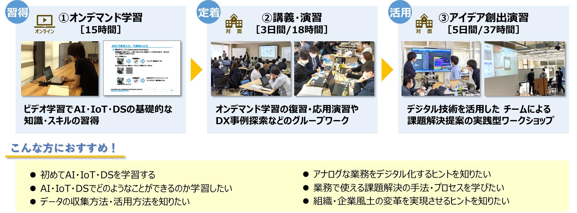 本プログラムは、どの業種・分野の方でも初心者から学べます。「(1)オンデマンド学習」「(2)講義・演習」「(3)アイデア創出演習」から構成されており、組織内でDXが実現できるよう、「AI」「IoT」「データサイエンス(以下、DS)」の基礎知識とスキルの習得を目指します。さらに、これらを活用したアイデア創出のプロセスと組織を活性化させるためのマインドを学習し、DXを推進できる人材を育成します。