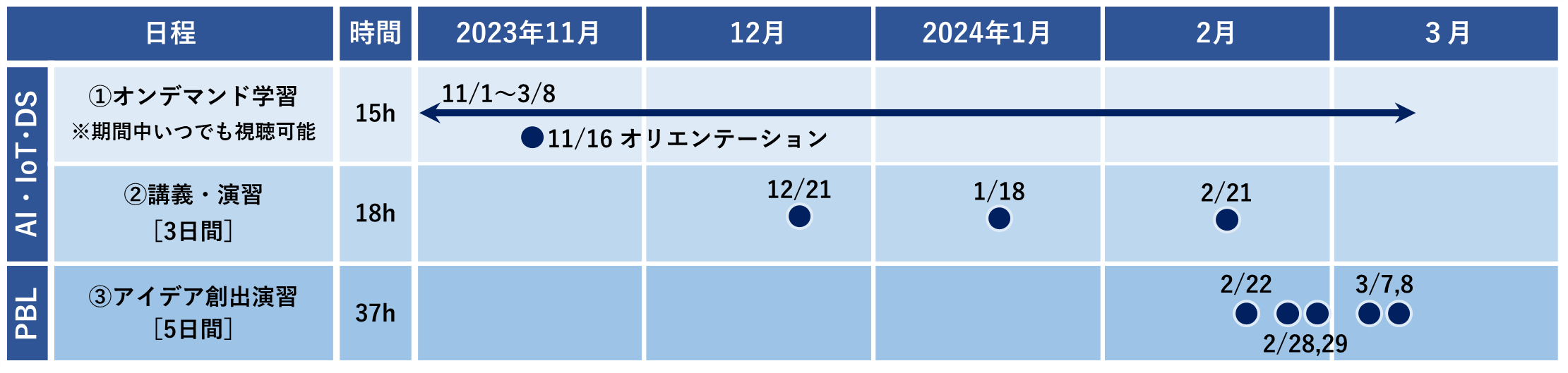 「(2)講義・演習」は3日間、「(3)アイデア創出演習」は5日間、ともに対面で受講いただきます。