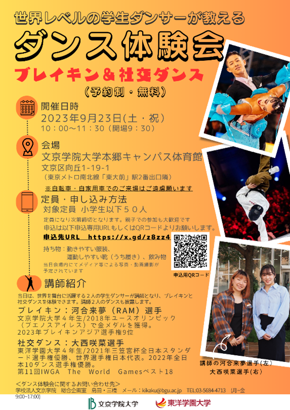 このたび、ともに文京区に位置し世界で活躍するプロダンサーを学生として持つ本学と文京学院大学の共催で、ブレイキンと社交ダンスの体験を目的とした小学生以下が対象のダンス教室を開催します。