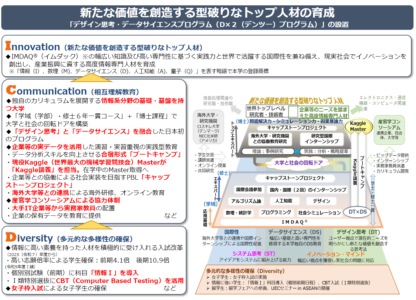 情報理工学域I類(情報系)及び大学院情報理工学研究科博士前期課程情報学専攻の専門教育プログラム「デザイン思考・データサイエンスプログラム」(学士・修士一貫プログラム)を2024年度(令和6年度)4月から一層強化・拡充し、入学定員をそれぞれ学域では30名増員して45名に、博士前期課程では10名増員して20名とします。さらに、理工系分野における女性の活躍を推進するため本プログラムの学校推薦型選抜を女子枠により実施します。
