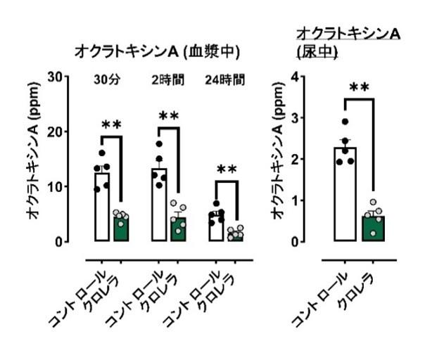 マイコトキシンの一種であるデオキシニバレノール、オクラトキシンAとヤエヤマクロレラを混合した溶液をそれぞれ絶食後のマウスに摂取させ、投与後30分、2時間、24時間の血漿および尿を採取し、各種マイコトキシン濃度を測定しました。その結果、血漿中のデオキシニバレノール濃度がヤエヤマクロレラの混合により有意に減少しており、ヤエヤマクロレラがデオキシニバレノールの吸収および代謝を阻害している可能性が示唆されました(図1)。また、オクラトキシンAも同様に血漿中および尿中濃度がヤエヤマクロレラ投与群で有意に減少しており、ヤエヤマクロレラがオクラトキシンAの吸収阻害に有効であることが示唆されました(図2)。
