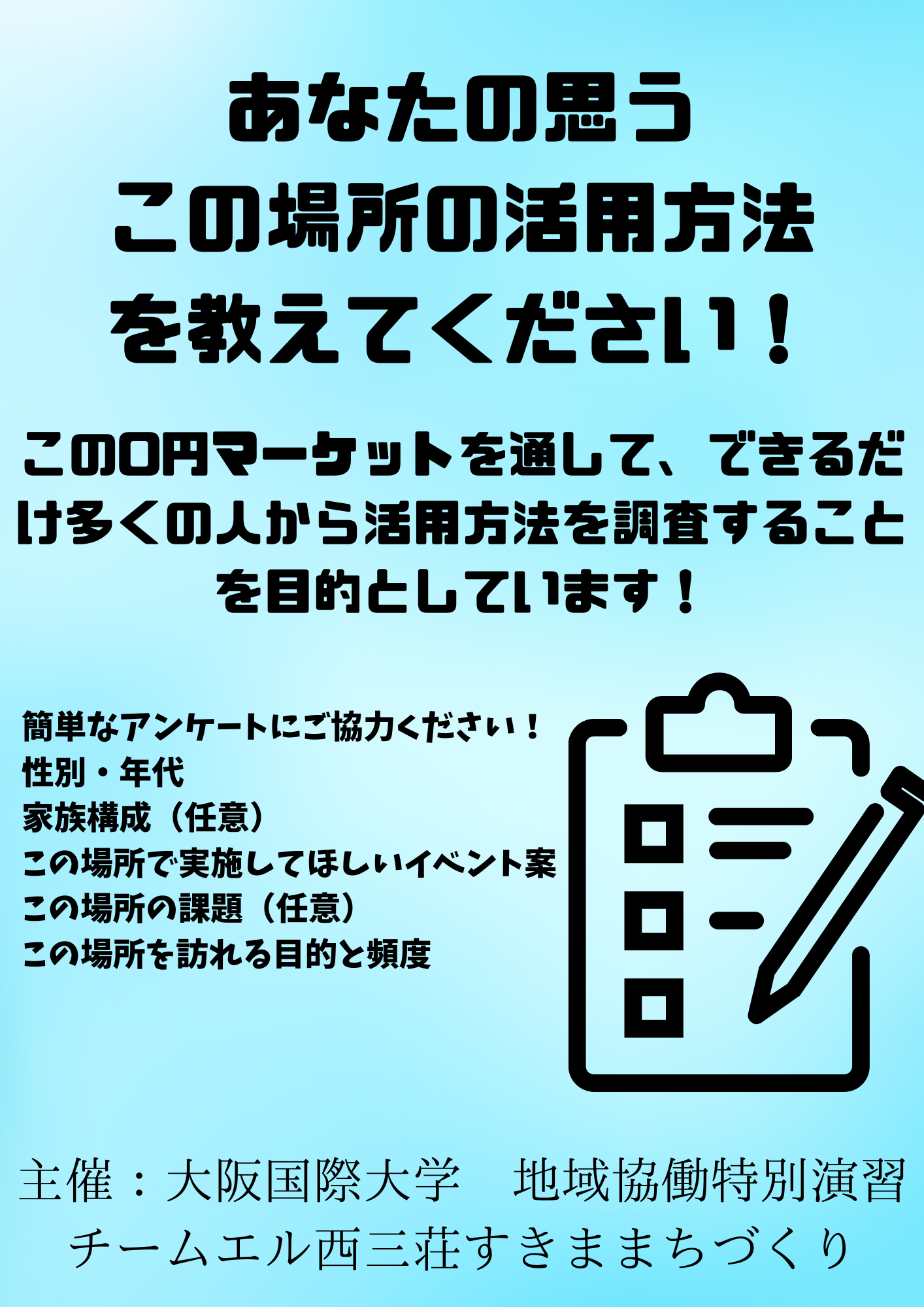 【目 的】0円マーケットを通して、できるだけ多くの人からエル西三荘高架下広場の活用方法のニーズ調査をすること