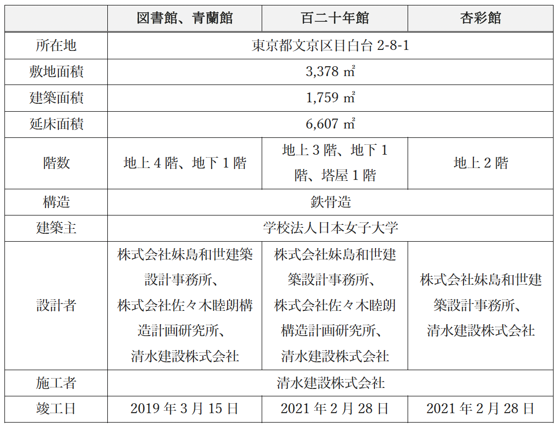 創立120周年の目白キャンパス再整備計画である。開放的な建築計画は、キャンパス全体のラーニングコモン化を目指し、目白通りと不忍通りに面した青蘭館と杏彩館のアーチ屋根形状と、図書館、百二十年館に繰り返されるアーチ屋根形状は印象的なキャンパスファサードを創出している。 (出典:日本建設業連合会公式ウェブサイト)