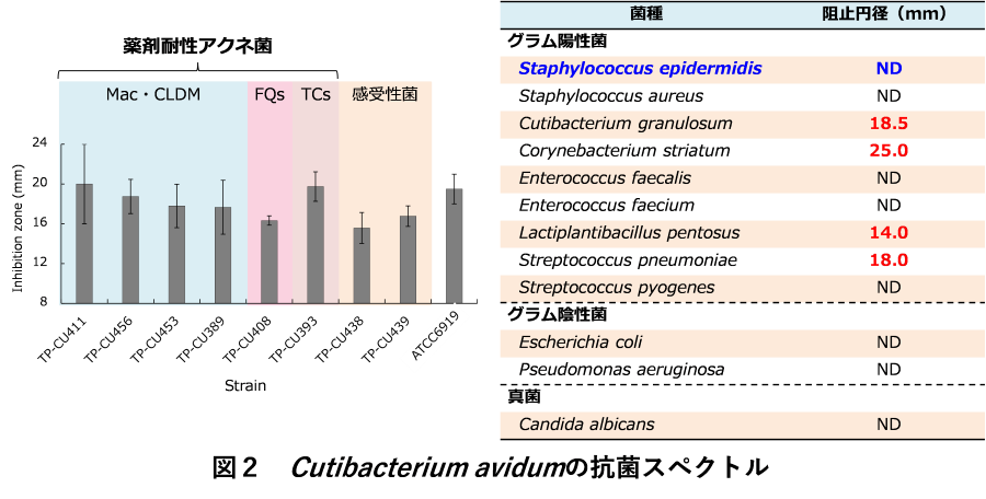 Avidumicinは、皮膚常在菌であるブドウ球菌属菌には作用せず、一部の近縁種の増殖のみを阻害することが分かりました(図2)。さらに、実際のニキビ患者から分離された薬剤耐性株に対する有効性も確認できました。