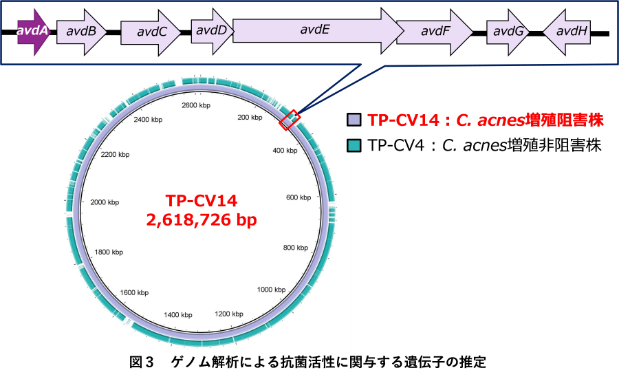 私たちは、このような現状を踏まえ、薬剤耐性菌の出現リスクが少なく、他の皮膚常在菌への影響が少ないニキビ治療薬の開発を目指して研究を行ってきました。そのシーズとして着目したのが、細菌が産生する抗菌ペプチドです。抗菌ペプチドは、従来の抗菌薬とは異なる機序で作用するため、薬剤耐性菌の出現リスクが低く、一部の細菌にしか作用しないため、常在菌に与える影響が少ないといった利点があります。今回、私たちは、アクネ菌の増殖を阻害する新しい抗菌ペプチドとして、皮膚常在菌の一種であるCutibacteirum avidumが産生するAvidumicinを発見しました(図1)。