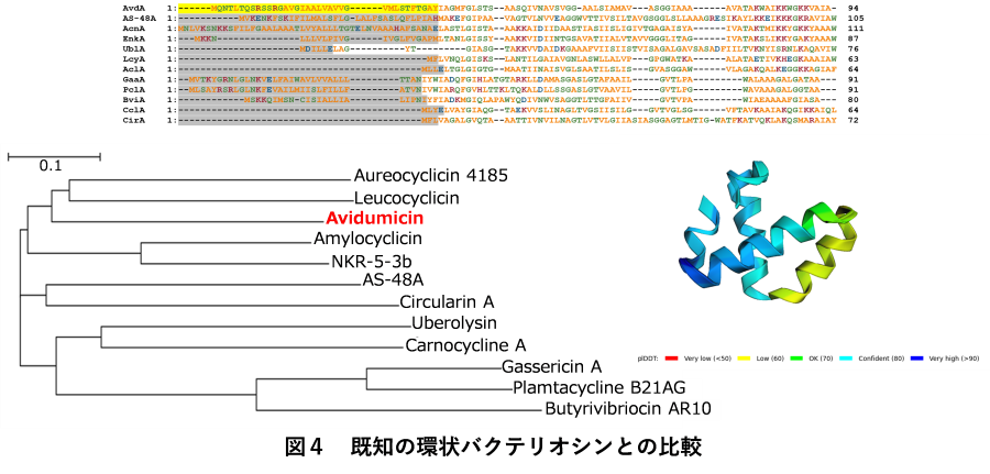 C. avidumのアクネ菌増殖阻害株と非阻害株の全ゲノム配列を比較することで、抗菌ペプチドをコードするavdAと抗菌ペプチドの産生と分泌に関与すると予想される遺伝子クラスター(avd gene cluster)を特定しました(図3)。明らかになったタンパク質の配列をデータベースと照合し、環状の抗菌ペプチドであることが推測されました(図4)。また、立体構造の予測においても環状であることが示唆されたため、C. avidumが産生する新規環状抗菌ペプチドを『Avidumicin』と命名し、特許を取得しました(特許7267644:抗菌性ポリペプチド、抗菌性組成物および医薬組成物)。