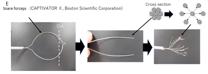 さらにスネアーカンシ先端を加工して、内視鏡先端から手動で開閉するカンシを作成した(図2_E)。