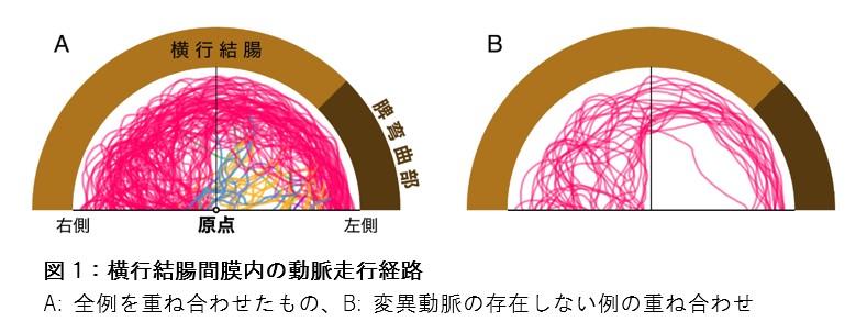 その結果、全例における動脈の走行経路を比較することができました(図1A)。教科書的な動脈しか存在しない場合には、横行結腸間膜の左半分では動脈は腸管に沿って走行するのみであり、原点付近に動脈の走行しない空間が存在することを確認できました(図1B)。一方で、変異動脈として分類される動脈が横行結腸の左半分に分布する場合、この空間を横切ることが明らかになりました(図1A)。