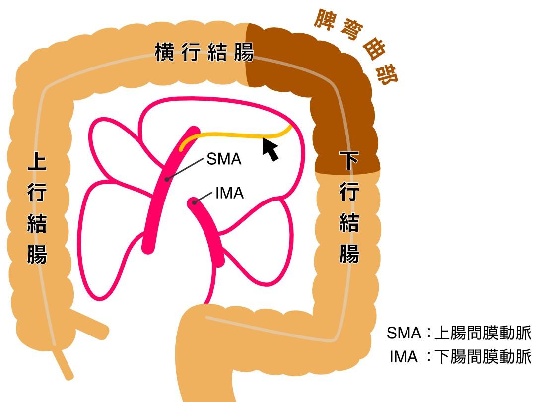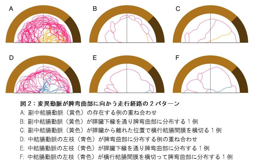 図2:変異動脈が脾弯曲部に向かう走行経路の2パターン
