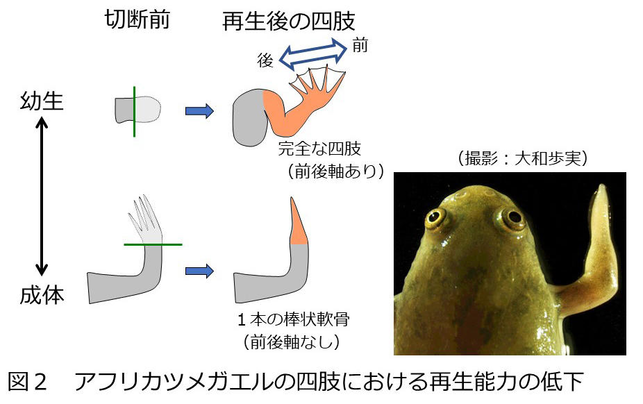 アフリカツメガエルの場合は幼生(オタマジャクシ)では、四肢を切断しても元通りに再生する。四肢の親指の側を前側、小指の側を後ろ側とすると前側-後ろ側に沿ったパターン(前後軸)も元通りになる(図2)。しかし尾の消失などの体の作り替え(変態)が完了して成体になると再生能力が低下し、四肢を切断しても1本の棒状軟骨しか再生できず、四肢の前後軸に沿ったパターンは見られない(図2)。