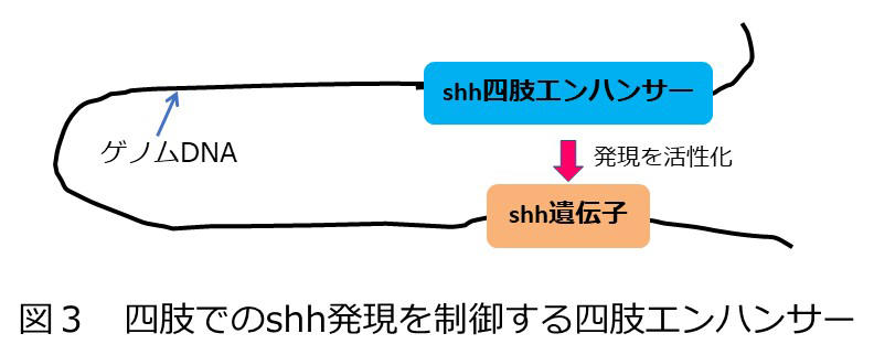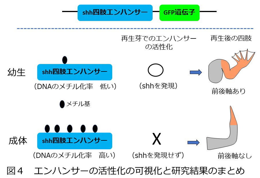 近年の研究から、四肢におけるshhの発現は同じ染色体上に存在する四肢エンハンサーと呼ばれるゲノム領域によって調節されることがわかってきた(図3)。さらにツメガエルにおいては、幼生では四肢エンハンサーのDNAが低メチル化状態にあるのに対して、成体では高メチル化状態になることから、DNAのメチル化というエピジェネティクス制御によって四肢エンハンサーが不活性化されることで、成体の四肢ではshhを発現できなくなっている可能性が示唆された。しかし両生類の四肢再生におけるshh四肢エンハンサーの活性化の有無についての検証はこれまで行われてこなかった。またエンハンサーの活性化と四肢の再生能力との対応についてもわかっていなかった。