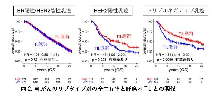 一方で、腫瘍内TILが多いER陽性/HER2陰性乳がんでは乳がん細胞増殖が促進していることがわかりました。手術前化学療法との関係では、腫瘍内TILは必ずしも完全奏功(がんの兆候がすべてなくなること)とは関連しませんでしたが、HER2陽性、トリプルネガティブ乳がんにおいて腫瘍内TIL量は乳がん生存率と有意に相関することがわかりました(図2)。