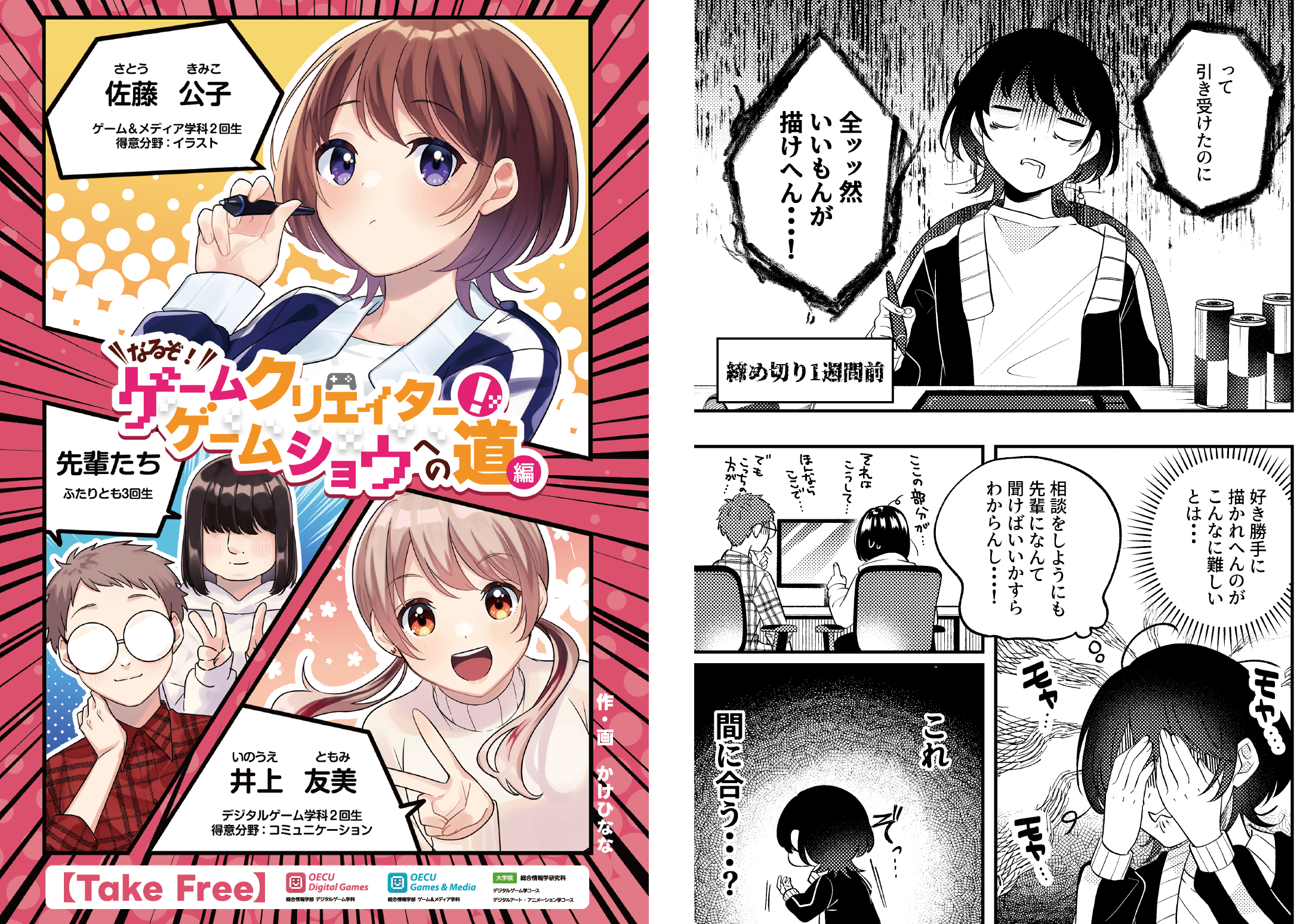 「BitSummit」(*)には2017年から出展しており、今回で7回目の参加。今年は学生作品の応募にあわせて、特別短編冊子「なるぞ!ゲームクリエイター!~ゲームショウへの道編~」を学生とOBが制作し、学内で配布した。