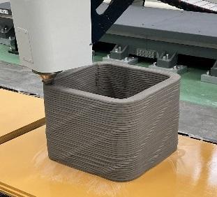 2022年4月に、金沢工大のLabにロボットアーム式3Dプリンターを設置して、3Dプリンティングに適したCO2-SUICOMの配合や、3Dプリンターの制御方法等について研究を重ねてきました。その結果、これまでに複雑な形状をもった最大長さ5mの部材を造形しました。
