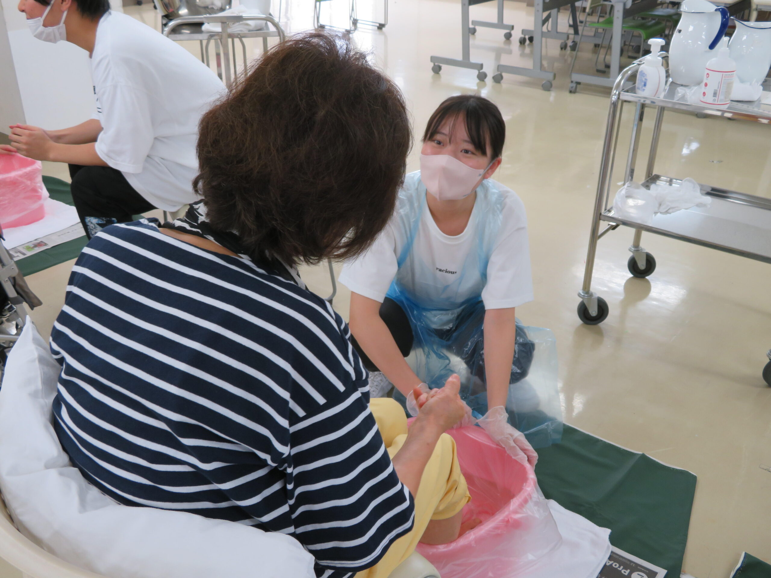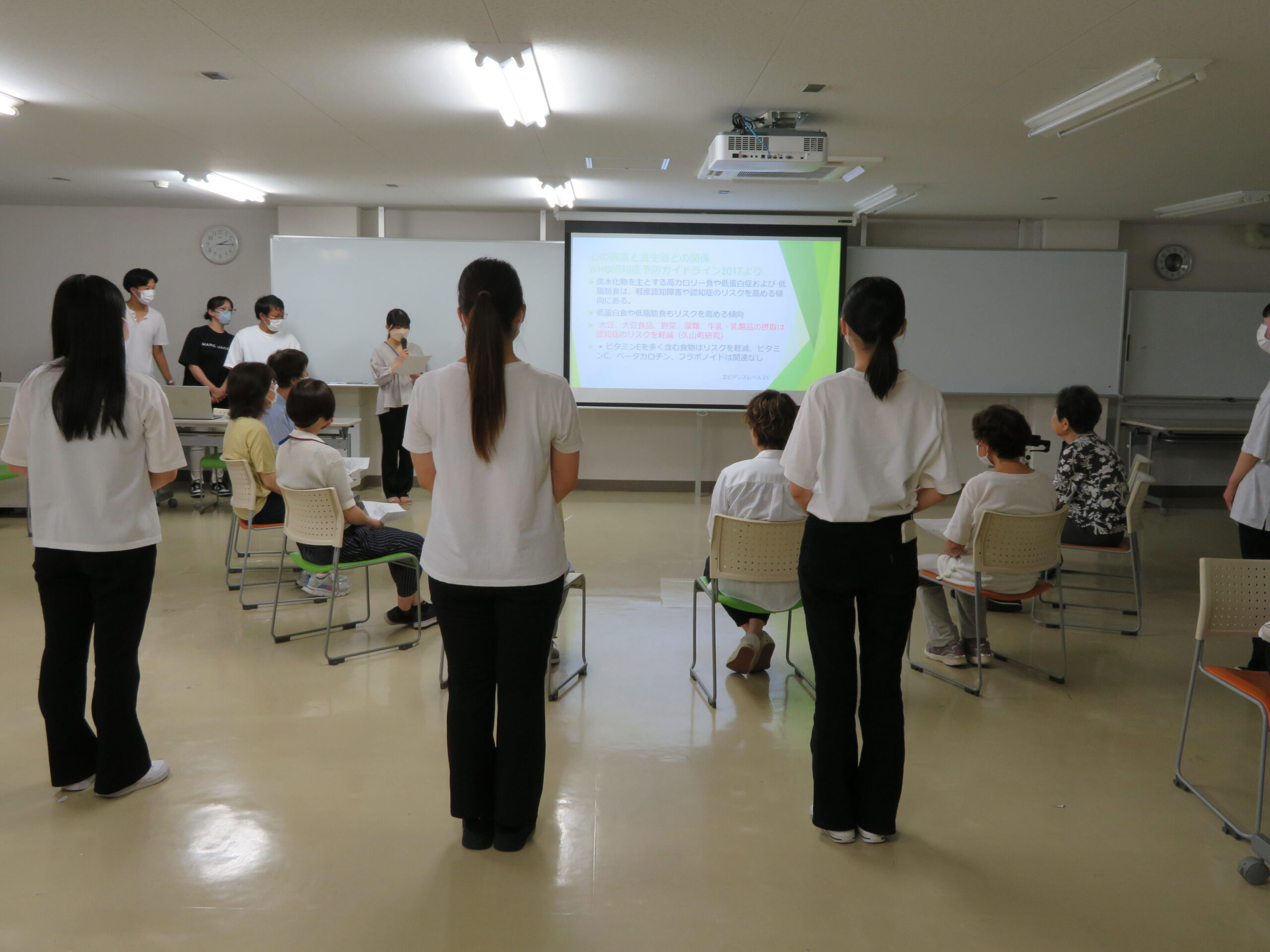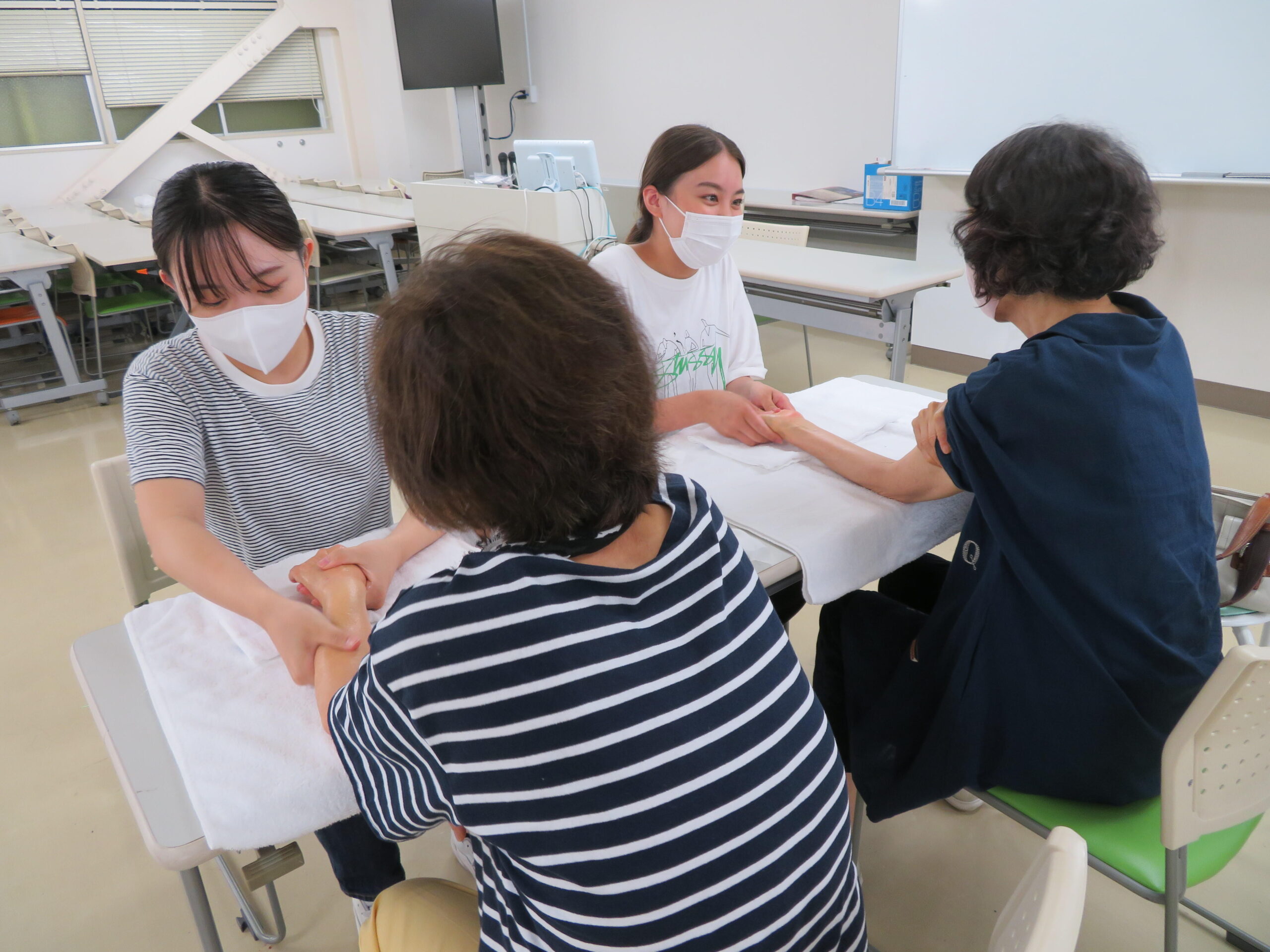 当日は、学生が考えた健康体操や、学生による足浴(足湯)、アロマハンドマッサージなど、健康増進に関する実践的な内容を実施しました。