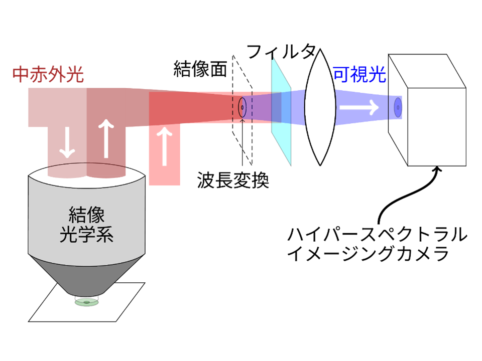 中赤外ハイパースペクトルイメージングは、中赤外光を波長分解しながら画像を取得する技術であり、さまざまな分野で大きな効果を発揮している。既存技術では、熱光源や量子カスケードレーザ (QCL) からの光を試料に照射し、その透過あるいは反射光に対して赤外光用検出器で像を計測する。熱光源は、波長帯域は広いが強度が低く、QCLは、強度は高いが波長の帯域が狭い。そのため、現在の中赤外ハイパースペクトルイメージングでは、可視光領域に比べて、数十倍以上の時間がかかっていた。可視光の装置であれば数秒で測定できるような波長の数と解像度の画像は、中赤外の装置では数分以上、場合によっては数日かかる計算になることもあった。