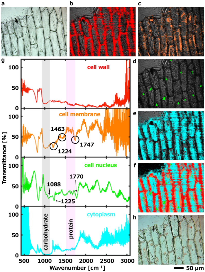 図 2 はタマネギ鱗茎(りんけい)の表皮細胞を観察した結果である。形態学的にタマネギ鱗茎の表皮細胞の細胞壁と細胞質を可視光顕微像で区別することができるが、染色せずに細胞核を観察することができない。一方、中赤外ハイパースペクトルイメージングでは、染色することなく、細胞壁、細胞膜、細胞核および細胞質を区別することができた。また、8秒という非常に短い計測時間 (既存技術では7分程度) でマッピング像から抽出した中赤外透過スペクトル (図 2(g)) から、タンパク質、糖質、リン脂質といった生体分子を計測することに成功した。