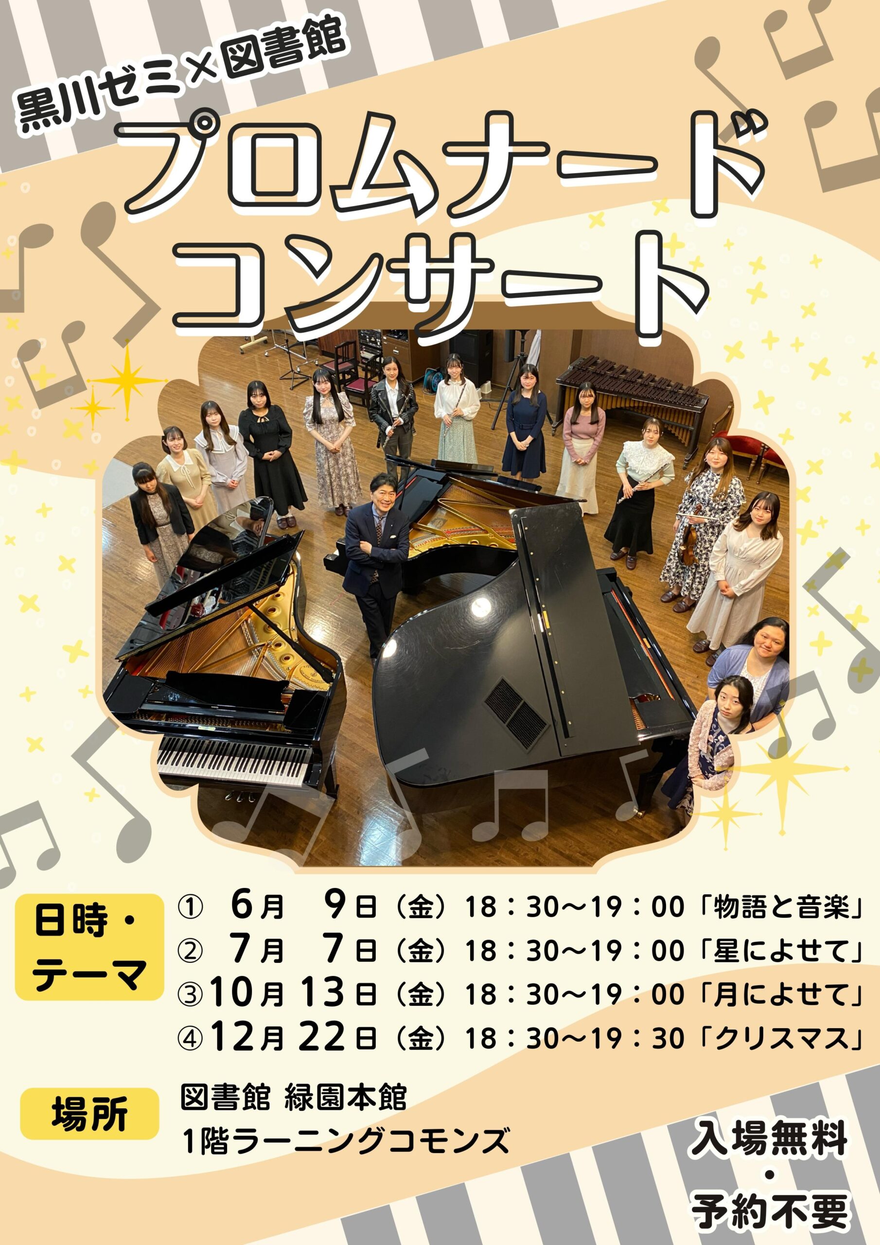 フェリス女学院大学(神奈川県横浜市/学長:荒井真)緑園キャンパスの図書館(館長:谷知子教授)で、黒川浩(音楽学部音楽芸術学科教授)ゼミ生が企画、演奏を行うコンサートを開催します。2022年度に続いて2年目となる今回は、一部学外の方(女子中高生・大学受験生の女子)にも公開します。入館には生徒証、学生証が必要です。また、コンサートのテーマに合わせてゼミ生が選書を行い、書籍の企画展示も同時開催いたします。