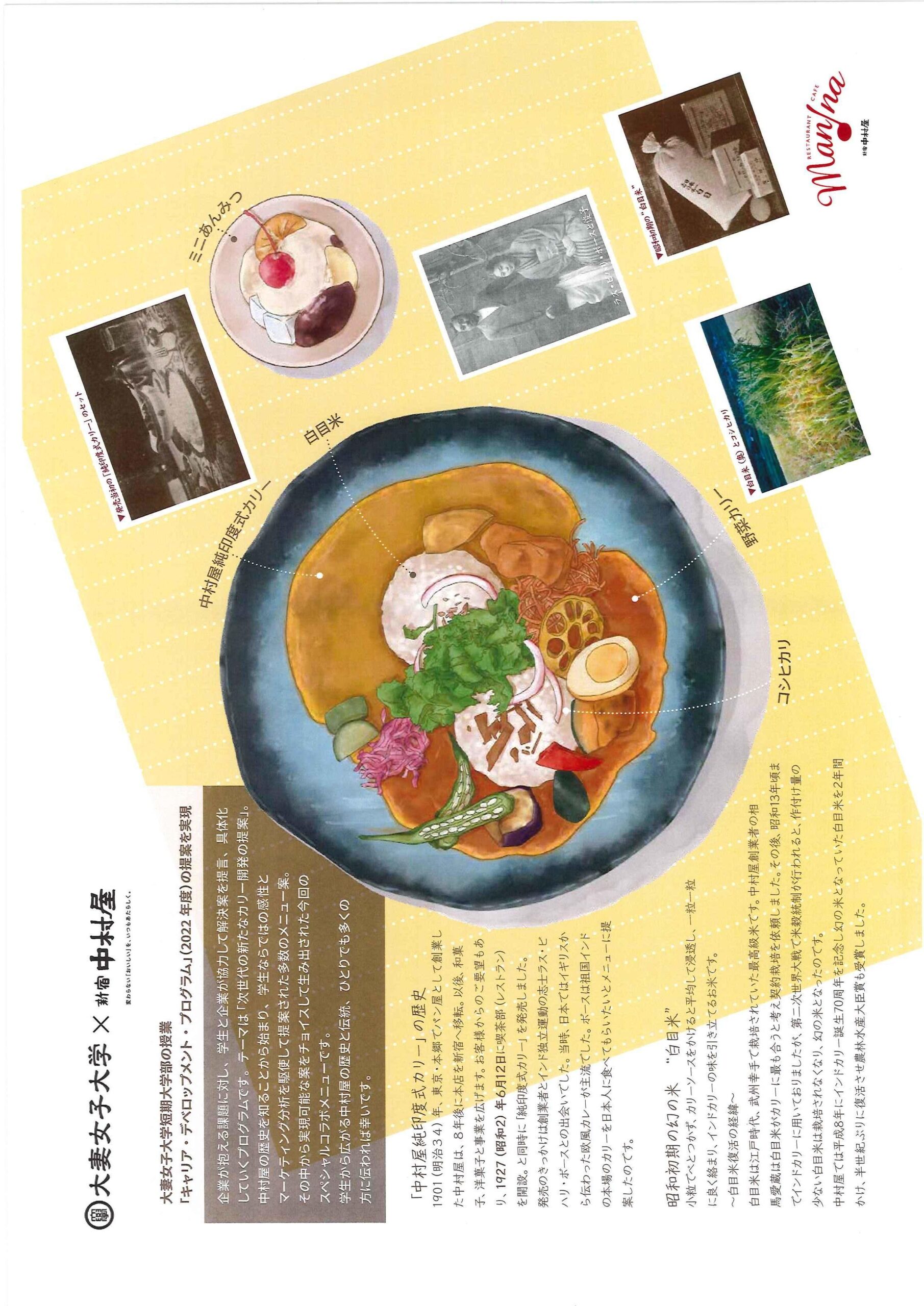 同メニューは6月19日(月)から30日(金)までの期間、中村屋のメニューを提供するレストラン&カフェ Manna /マンナにて、平日の17時から食数限定で一般販売されている。また、注文後からカリーが提供されるまでの間、器の下に敷かれるランチョンマット(同授業を受講していた短期大学部生活総合ビジネス専攻2年 西村さんがイラストをデザイン)から新宿中村屋の歴史や伝統、学生の学びについて触れることができる。