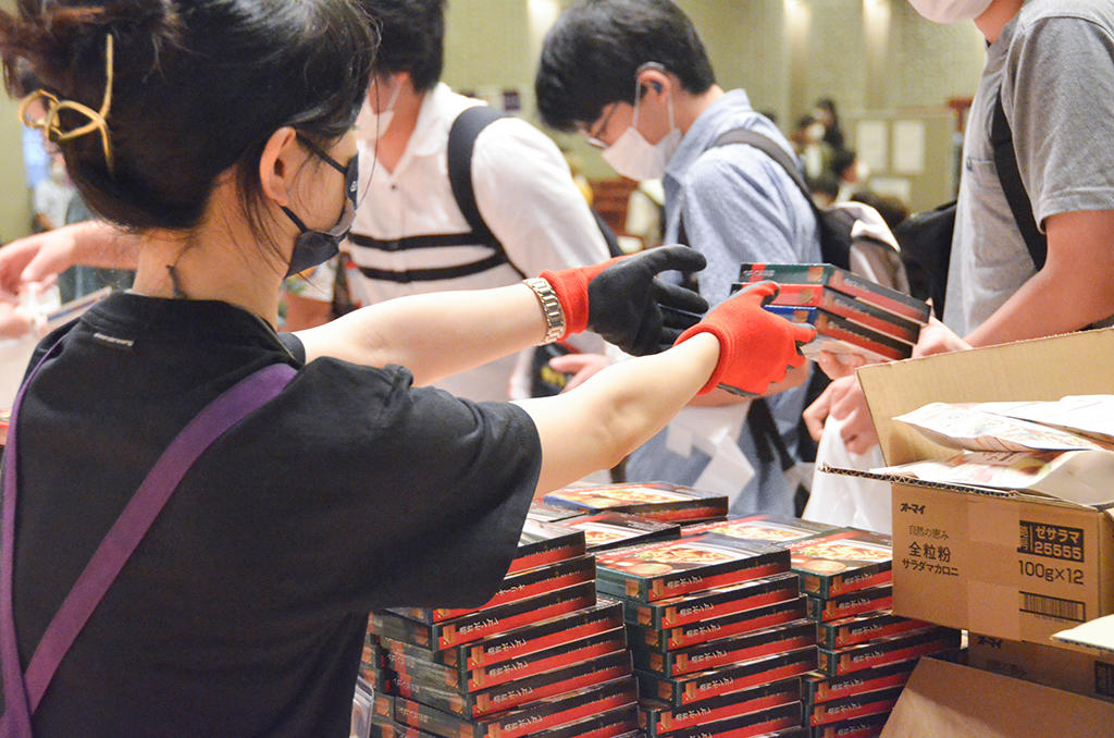同大では今年5月にも、東京都による新型コロナウイルス自宅療養者への宅配支援終了に伴い生じた残余の食料品の無償提供を受け、延べ2,649名の学生に30,000点超の食料品を配付。
