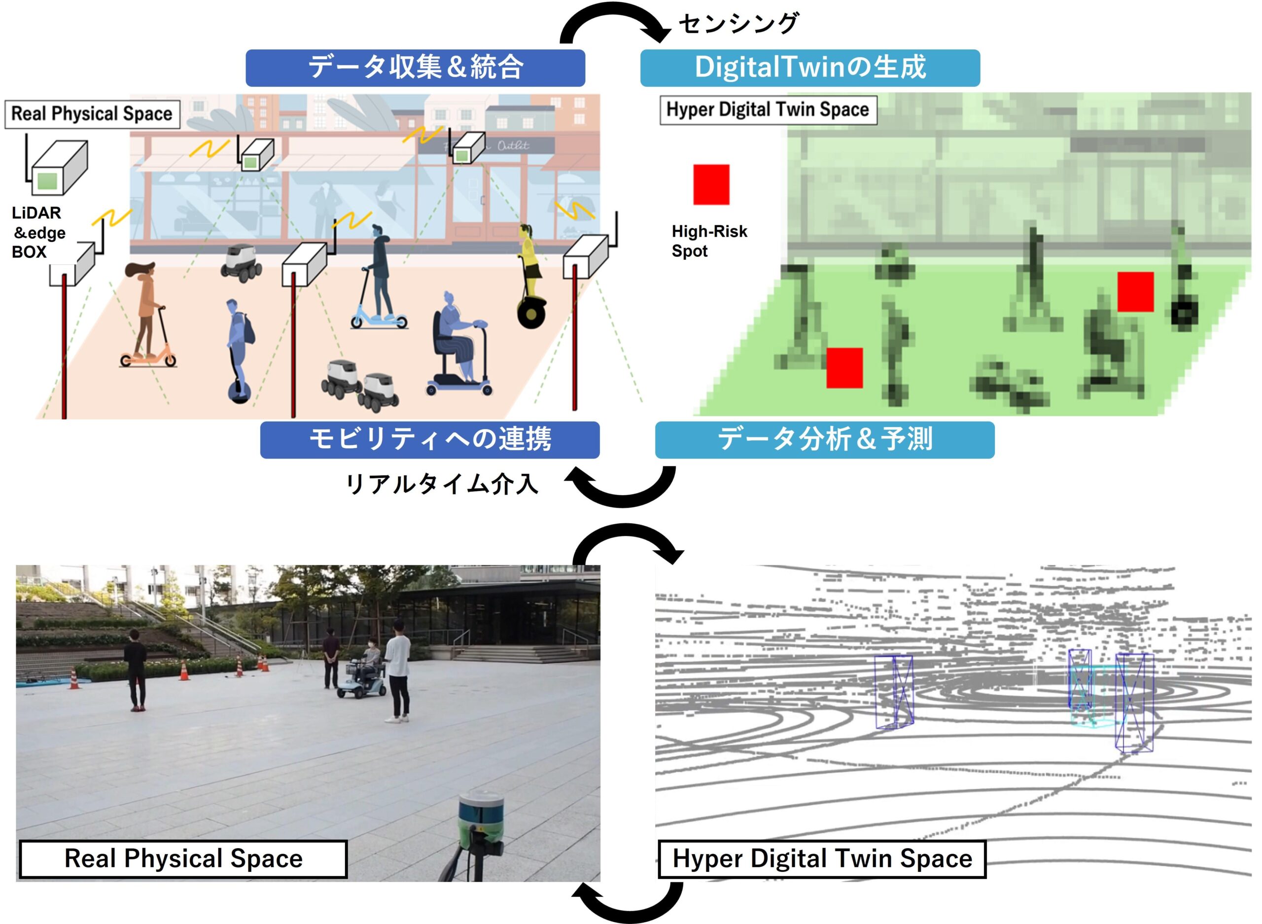 マイクロモビリティの自動運転化のニーズは高まっていますが、一定エリア内により多くの車両・ロボットが混在するほど、より高性能な車載センサユニット・計算ユニットが個々に必要になり、単体の車両・ロボットがとても高額になってしまいます。そこで、現実世界から収集したさまざまなデジタルデータを分析し、仮想空間を再現するデジタルツイン技術を使い、課題を解決します。仮想空間上で、現実に近い物理的なシミュレーションが可能となり、モビリティが自動運転に必要な自己位置情報や経路情報などを生成し、提供することが可能となります。また、死角などに起因するリスクの予測を行い、多数同時自律移動の安全性を飛躍的に向上させます。これが実現することで、車載センサユニット・計算ユニットの要求性能が下がり、車両単価を下げ、自律マイクロモビリティの普及促進に繋げます。