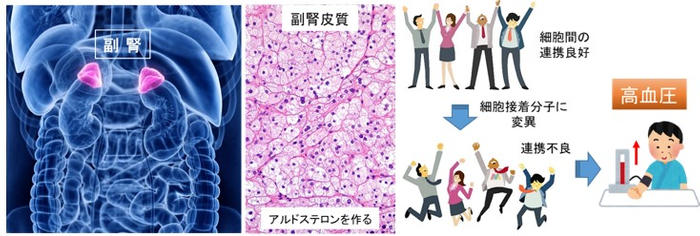 研究グループは、原発性アルドステロン症を引き起こす原因として、アルドステロンを産生する腺腫において、接着分子の役割を果たすCADM1という遺伝子に変異を発見しました。