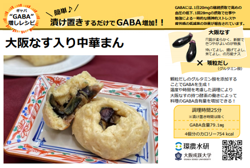 大阪成蹊大学と地方独立行政法人大阪府立環境農林水産総合研究所(環農水研)は共同で、大阪産(もん)に関する研究成果をもとに、簡単な漬け置き調理で機能性関与成分GABAを増加させた「GABA増しレシピ」を開発しています。本日から、新たに「泉州水なすの和風あんかけやきそば」と「大阪なす入り中華まん」の2品を以下のページで公開し、一部の直売所でレシピカードを配布します。