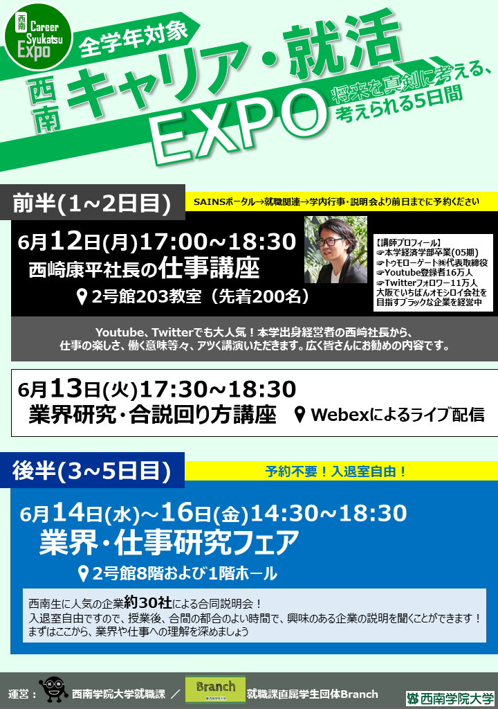 西南学院大学(福岡市早良区)では、6月12日(月)~16日(金)、「ー学生企画型キャリア支援イベントー 西南キャリア・就活EXPO」を開催します。