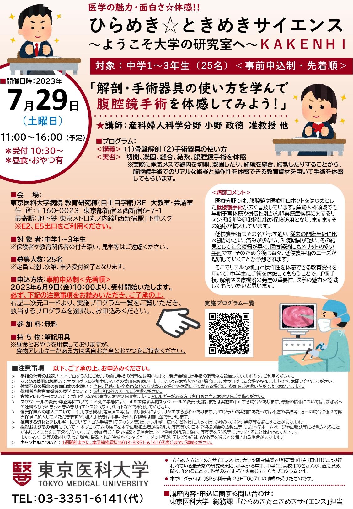 【東京医科大学】7月29日(土)ひらめき☆ときめきサイエンス~ようこそ大学の研究室へ~ KAKENHI「解剖・手術器具の使い方を学んで腹腔鏡手術を体感してみよう!」開催のお知らせ<6月9日(金)10:00~事前申込開始・先着順>