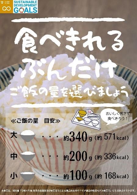 定食と丼ぶり、カレーライスのごはんの量を小盛・並盛・大盛の中から、学生が自ら考えて食べ切れる量を考えて選択できるようにしている。