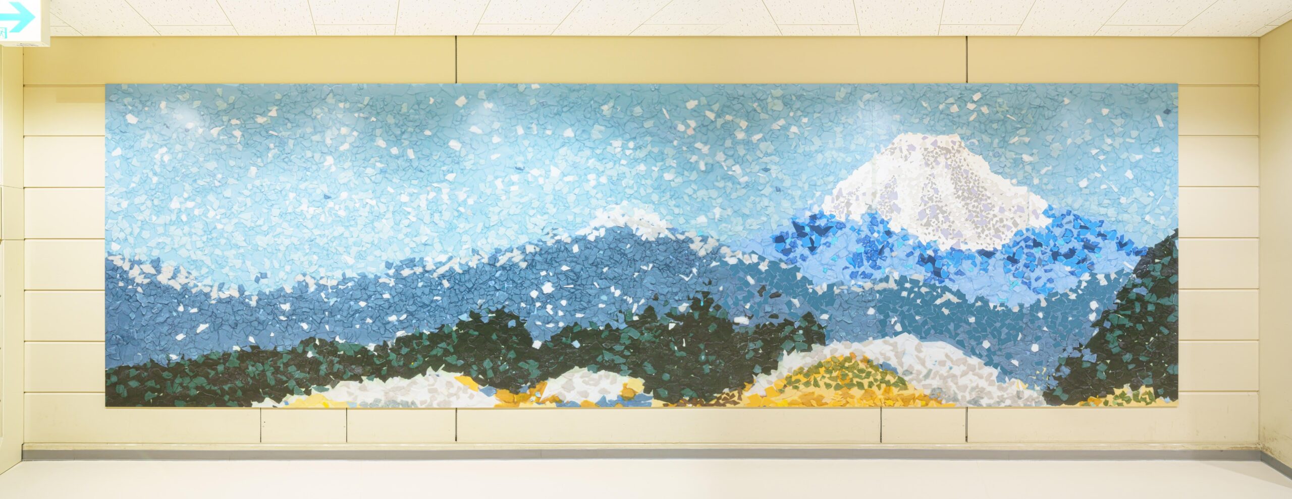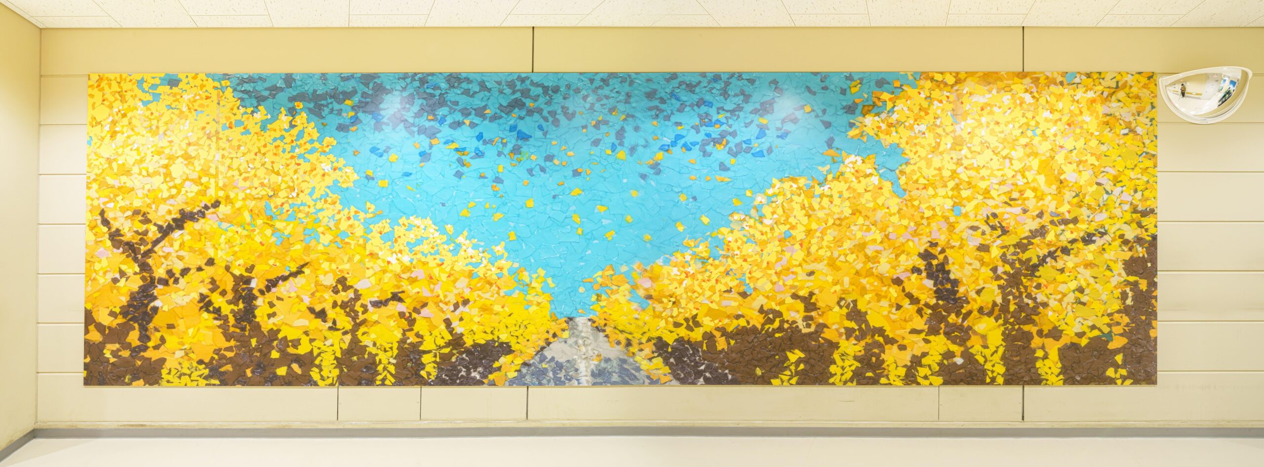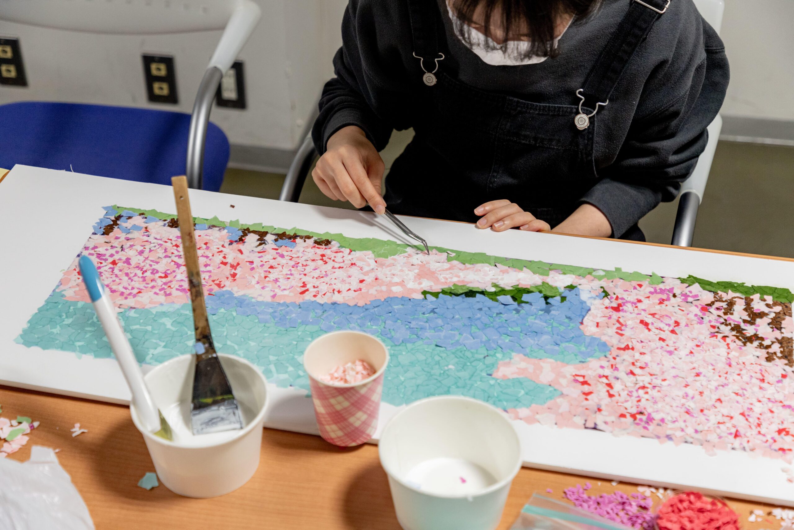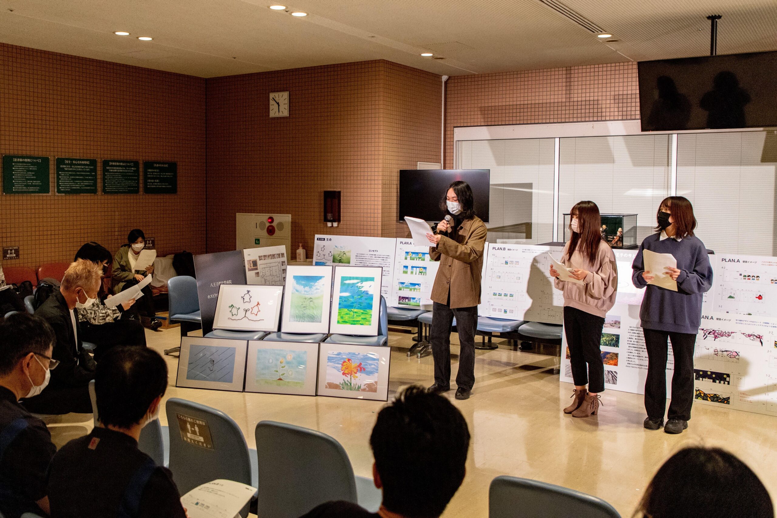 12月に各グループがデザイン案を病院にプレゼンテーションし、質疑応答やその後の検討を経て、ちぎり絵の手法を用いてデザインをした『折々の八王子』が採用案として選ばれ、地下の空間を明るく飾ることになりました。