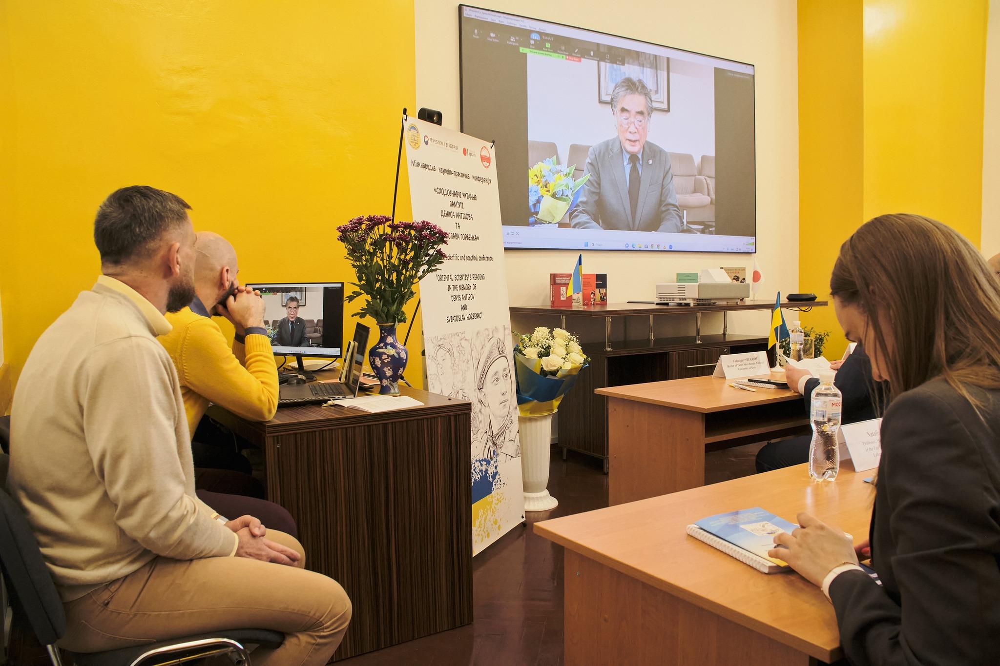 開設式・開会式では、Buhrov Volodymrタラス・シェフチェンコ記念キーウ国立大学学長、Hryhoryi Semenyuk 同大学人文教育・学術院院長の挨拶、松田邦紀在ウクライナ日本国大使の祝辞に続き、阪本浩青山学院大学学長の祝辞、入澤崇龍谷大学学長の祝辞がビデオ・メッセージで披露され、その後、KIM Hong Te在ウクライナ韓国大使の祝辞があった。