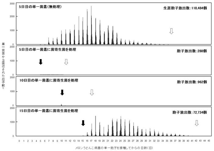 次の実験では、菌寄生菌を感染させたメロンうどんこ病菌が、生涯にわたりどれだけの子孫胞子を放出するかを検証しました。そこで、接種後5日目、10日目および15日目のメロンうどんこ病菌の単一菌叢を準備し、静電気技術※6 を用いて胞子数を計測しました。その結果、菌寄生菌を噴霧接種していないメロンうどんこ病菌(5日目の単一菌叢)は約28日間胞子を放出し続け、生涯で約12万個の子孫胞子を放出させることがわかりました。一方、5日目と10日目の単一菌叢に菌寄生菌を噴霧接種した場合、子孫胞子の放出はそれぞれ処理後約4日目と約8日目に停止しましたが、15日目の単一菌叢では、処理後約24日目に停止したことから、メロンうどんこ病の発生初期段階で菌寄生菌を感染させれば、効果的な防除ができるものと考えられました。さらに、メロンうどんこ病菌は、夜間には菌叢から子孫胞子を放出しないことから、菌寄生菌の噴霧接種は夜間に行うことで防除効果が上がるものと考えられました。以上のことから、メロンうどんこ病の感染拡大を未然に防ぐためには、うどんこ病菌の菌叢を見つけ次第、すなわち、発生の初期段階で対処する必要があることが、世界で初めて明らかとなりました。
