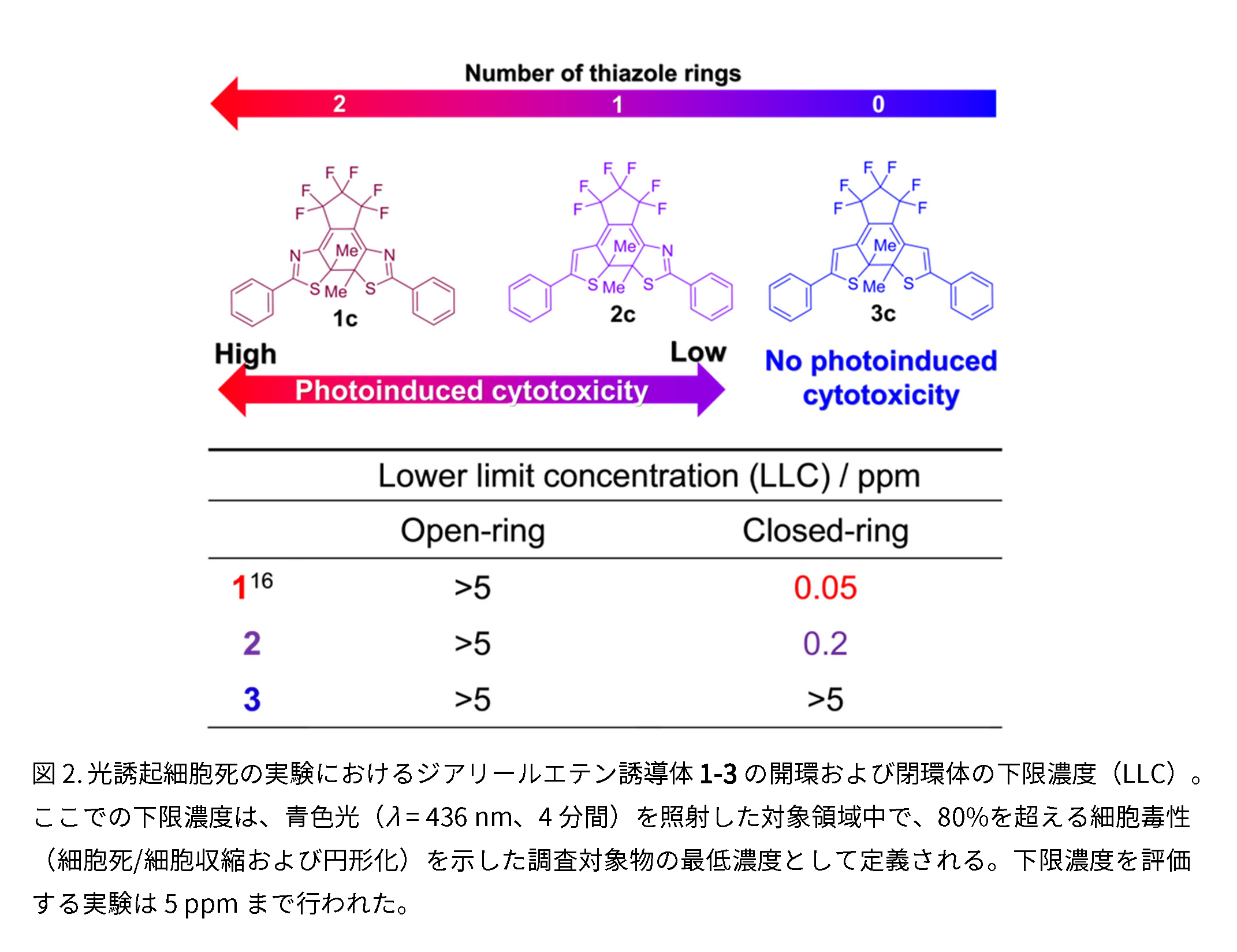 今回、光誘起細胞毒性の実験に用いられたジアリールエテン誘導体1, 2, 3の分子構造と光毒性を発現する最低濃度の関係を図2に示しました。全ての開環体に光毒性はなく、Nを含むチアゾール環を2つもつ1cが最も強い光毒性を示し、チアゾール環を1つもつ2cはそれより弱い光毒性を、チアゾール環をもたない3cは光毒性が見られませんでした。