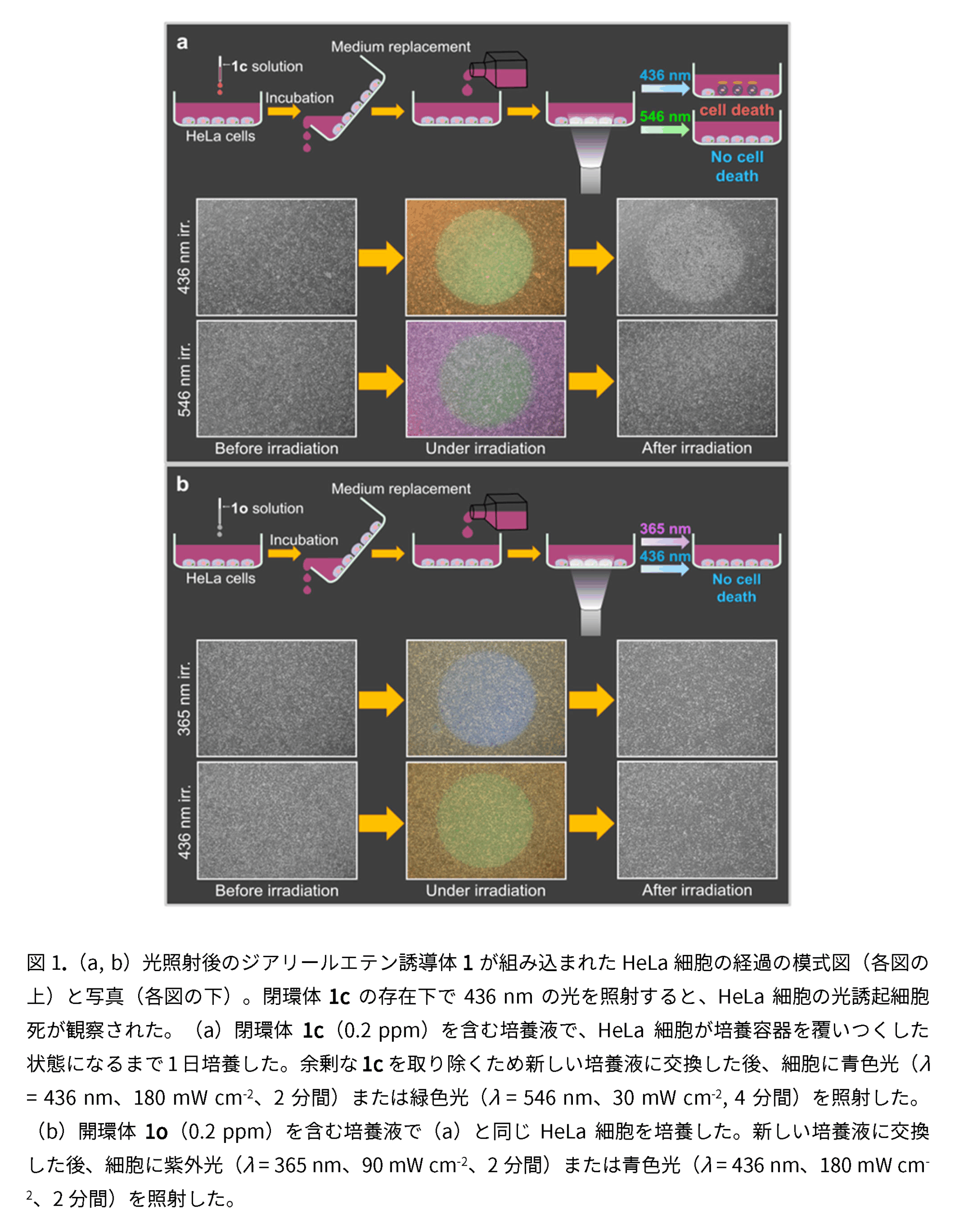 2015年には、あるジアリールエテン誘導体の存在下、青色光(λ = 436 nm)を照射するとMDCK細胞(イヌ腎臓尿細管上皮細胞由来の細胞)が死滅し、これがカスパーゼの活性化によるアポトーシスであることを報告しました(Chem. Commun., 2015, 51 (54), 10957-10960.)。