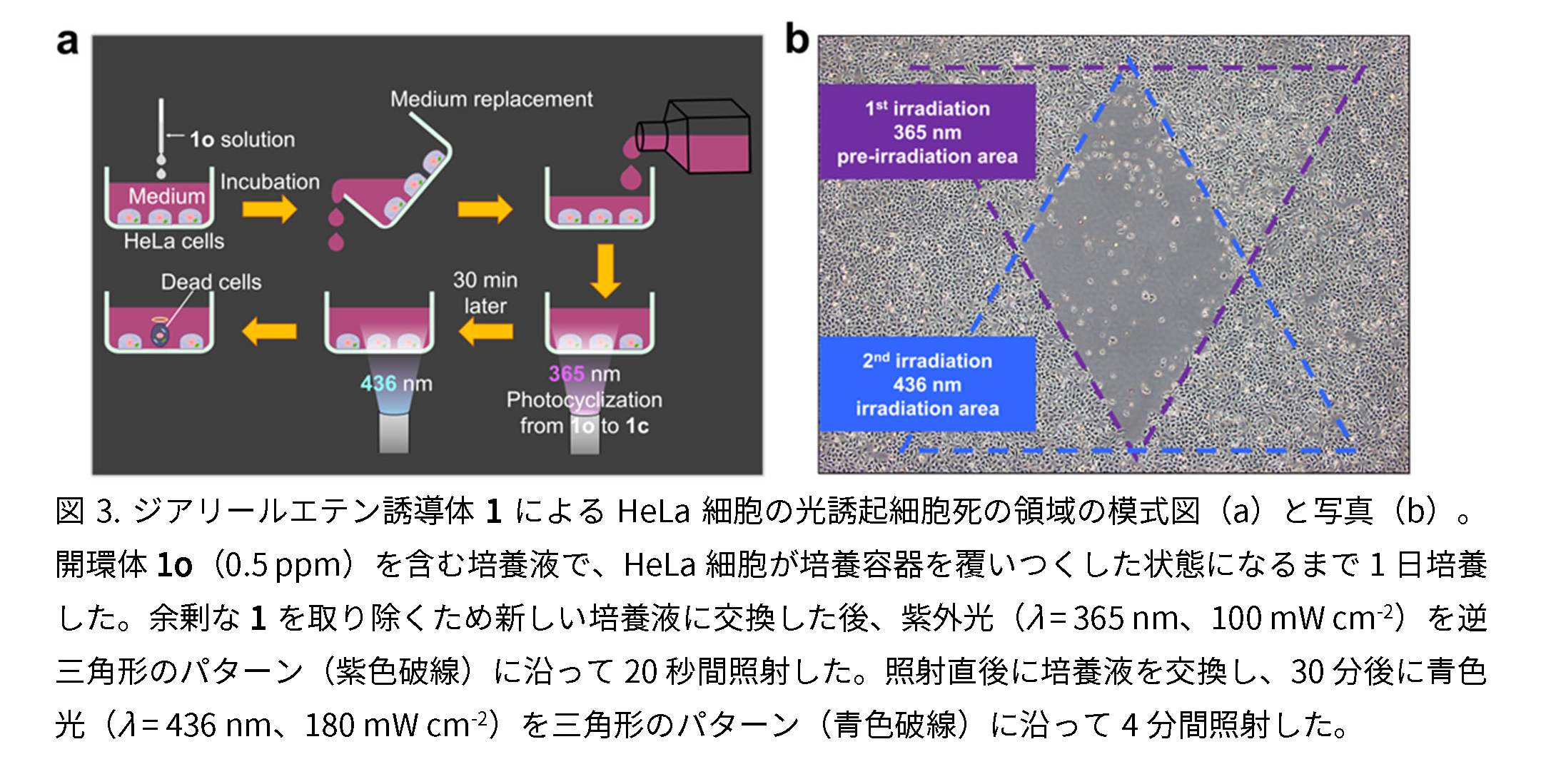 図3では、DNAへの挿入と繰り返し異性化が、それぞれ異なる波長の光によって制御され、両者が揃った場合にのみ細胞死が引き起こされることを明確に示すデモンストレーション実験の結果を示します。最初に開環体1oを加えてHeLa細胞を培養後、培養液を交換して余剰な1oを取り除き(図3a)、次に逆三角形の紫のライン内に紫外光(365 nm)を照射すると、細胞内の1oが1cに変換されます。続いて青色の三角形の部分に青色光(436 nm)を照射すると、2つの三角形が重なったダイヤ形の部分だけに細胞死が確認されました(図3b)。