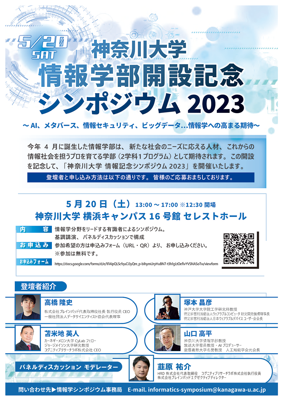 今年4月に誕生した情報学部は、新たな社会のニーズに応える人材、これからの情報社会を担うプロを育てる学部(2学科1プログラム)として期待されます。この開設を記念して、「神奈川大学 情報学部開設記念シンポジウム2023」~AI、メタバース、情報セキュリティ、ビッグデータ…情報学への高まる期待~を、2023年5月20日(土)13:00より開催します。登壇者は、高橋隆史氏、塚本昌彦氏、苫米地英人氏、韮原祐介氏、そして今年度新たに神奈川大学情報学部教授に着任したAIプロデューサー山口高平を迎えてお送りします。