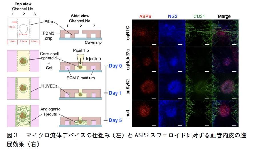 注4:マイクロ流体デバイス(チップ)は、半導体微細加工技術を用いて流路をガラスや樹脂基板上に作製したものである。臓器細胞を培養して生体内に近い環境を創成したチップは、Microphysiological systems (MPS)あるいは生体模倣システムと呼ばれる。今回の研究では、肉腫・周皮細胞・血管内皮の3種類の細胞を用いてASPSの血管形成を再現させた。